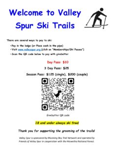 Supports the x-c grooming efforts and operations of the Valley Spur Trail system. All funds collected through this membership will support Valley Spur only. Season Memberships, Day and 3 Day can be purchased online.